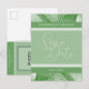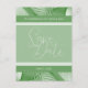 As folhas tropicais criam um apelo moderno e cativante para que elas salvem os cartões postais de lançamento. Apresenta tons de cor verde. Utilização para complementar temas de casamento tropicais e eventos especiais. A frente do cartão exibe "Salvar a Data" junto com os nomes do casal e a data do casamento ou evento. Os detalhes estão no verso, assim como o espaço para uma foto. O nome e o endereço de correspondência do destinatário também estão disponíveis se você quiser que ele seja impresso diretamente no cartão-postal. Use a modelo para personalizar.