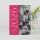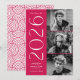 Convite de formatura sofisticado com três fotos do formando localizadas à direita do design em um layout vertical. "2023" é exibido em branco, com letras art déco modernas sobre um fundo magenta. Personalize o convite de formatura com foto moderna adicionando o nome do formando e o nome da escola. O design se inverte para exibir um fundo com redemoinho geométrico magenta e branco. Perfeito para formaturas tanto do ensino médio quanto da faculdade!