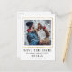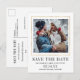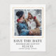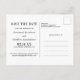 Um quadro fino em ouro rodeia a foto Salvar a data para criar um toque elegante. Salve a Data e a própria data é gravada em uma fonte de exibição grande. Seus nomes e localização em um texto simples e moderno. Mais informações são fornecidas na parte traseira do cartão postal Salvar a Data.