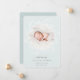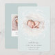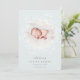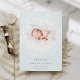 O anúncio de nascimento elegante em cores moles apresenta uma fotografia redonda de recém-nascidos rodeada por uma coroa de galhos e folhas botânicas brancas, com "introdução de [Nome]" no fundo em letra de cinza. Personalize com a data de nascimento do bebê, e as estatísticas de natalidade abaixo, e adicione uma mensagem pessoal às costas, juntamente com uma foto adicional.