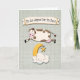 O anúncio de adoção é baseado na rima de berçário A Vaca Saltou sobre a Lua. Uma vaca branca está pulando sobre uma lua com uma estrela balançando do topo. A lua está descansando entre as nuvens. Uma faixa acima diz "A vaca pulou sobre a lua". Personalize o dentro com o nome e a data de chegada do seu novo filho, etc.