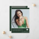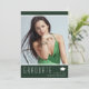 Cartões de anúncio de graduação em na moda, com texto moderno com aparência elegante e profissional. A foto dos formandos na frente da placa é aprimorada por quadros translúcidos finos na parte superior e inferior, enquanto a parte traseira da placa oferece espaços de texto personalizados para informações sobre a graduação e a viagem futura. Os fundos são verdes com texto branco na frente e tons de sábado e verde na parte traseira. Para ver mais itens como este, visite minha loja aqui em "www.Zazzle.com/LakeViewCardCo". Obrigados