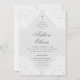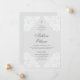 Um convite elegante para o batismo, com cantos brancos de renda suaves em um fundo de cinza neutro e macio.