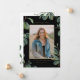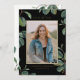 Anuncie a sua formatura à família e amigos com este cartão de anúncio personalizável de graduação de fotos. Apresenta folhas de aquarela sobre fundo preto. Personalize este anúncio de formatura em fotos de boho, adicionando uma foto, um nome, uma escola e outros detalhes. Este anúncio de graduação em fotografia botânica está disponível em outros estoques de papelão.