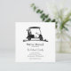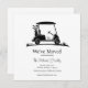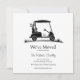 This elegant minimalistic black silhouette is of a golf cart with golf bag and a bucket of golf balls for a moving announcement.