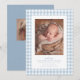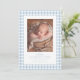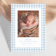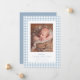 Apresente seu novo bebê com este doce e simples anúncio de nascimento em xadrez azul. A frente do design clássico apresenta uma moldura de xadrez azul e branco com uma única foto vertical, juntamente com texto personalizável e muito espaço para o nome do bebê, data de nascimento, estatísticas e mais. O verso é um azul poeirento coordenado com pontos brancos e apresenta espaço para uma segunda foto. Este design faz parte da coleção "oh baby" xadrez por Lea Delaveris Design e também está disponível em outras cores e como um download digital de anúncio de nascimento. Encontre peças coordenadas como envelopes, forros de envelope, cartões de agradecimento e mais na coleção.