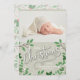As palavras Feliz Natal, folhas e bagas brancas destacam sua foto favorita de recém-nascido com seus nomes e saudações em letra chica. A informação de nascimento do seu bebê nas costas. Você pode mudar a cor de fundo na parte frontal, na parte superior e inferior. **ADICIONE mais fotos no verso também! Selecione Matte para o papel mais pesado e alta definição para melhor qualidade de impressão.