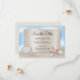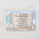 Anúncios elegantes de salve a data para um casamento com tema de praia com conchas, dólares de areia, uma estrela-do-mar e uma mensagem, sob um céu azul.