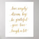 viver simplesmente, sonhar grande, ser grato, dar amor, rir de muita arte inspiradora, citações, ouro, caligrafia, impressão de escritório