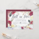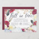 Os convites rústicos elegantes para festas de noivado de outono ou outono apresentam uma borda de flores de cor d'água, penas de vassoura e abóboras brancas. "Apaixonar-se" aparece por cima em letras de escala gráfica. Personalize com seus detalhes de celebração de noivado abaixo em letras azuis ricas de marinho.