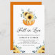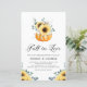 Se apaixonem! Esta festa de noivado do tema do outono apresenta abóbora aquarela com girassóis amarelos, algodão e folhas de eucalipto. Personalize adicionando nomes, data, hora, local e outros detalhes do evento. Este convite para girassol rústico é perfeito para noivados de outono ou outono.