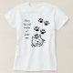 Quatro estampas pretas de pata de gato estão em um lado desta camisa, com o texto preto no outro que diz "Apenas meu gato anda por toda parte". Abaixo das pegadas de gato está uma imagem de desenho animado de um gato feliz vestindo uma coroa. Bonita!