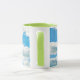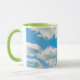 Apenas relaxe com uma bebida morna na caneca branca nuvem-coberta com guarnição verde e "respire… apenas respiram" a mensagem