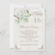 Vista através da janela em horizontes novos. Flor e abelha frescas da maçã em um convite de aniversário do doce 16 do primeiro plano.