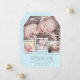 Design castanho macio, branco e elegante para um anúncio de nascimento de um bebê doce - completo com espaço para quatro fotos da sua nova cara. Com a tipografia moderna e o fundo azul pastel e branco listrado na frente e coordenando o padrão listrado no verso - este anúncio é uma forma adorável e moderna de apresentar o seu novo bebê ao mundo. Adicione um doce embelezamento de fita amarrado pelo buraco no topo e torne-o ainda mais especial!