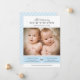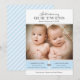Compartilhe a chegada dos seus gêmeos meninos com este clássico cartão de anúncio de nascimento "Apresentando Nossos Gêmeos". Uma foto de recém-nascidos é exibida acima de dois blocos de nome azuis correspondentes com o nome de cada bebê, hora de nascimento, peso e comprimento, conectados por um acento de coração cinza. O verso apresenta um padrão de listras diagonais azuis e brancas. Todo o texto e cores são totalmente personalizáveis.