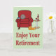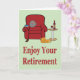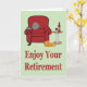Aproveite seu cartão de aposentadoria O cartão perfeito para qualquer um que esteja prestes a se aposentar. Apresentando uma poltrona vermelha confortável, uma mesa lateral com uma garrafa e um copo de vinho tinto e um gato deitado no chão ao lado da cadeira criando uma imagem quente e acolhedora. Tudo definido em um fundo verde pastel com a mensagem simples "Aproveite sua aposentadoria" em vermelho. Coloque sua própria mensagem de aposentadoria especial dentro. Visite nossa loja para mais designs de excelentes