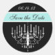 Preto e Branco Chandelier, salve a data em adesivos personalizáveis com uma banda aqua, fácil de personalizar com seu casamento ou data de evento. Temos a design nos convites de casamento, nos cartões RSVP, nos rótulos de endereços, nos avisos de agradecimento e muito mais.