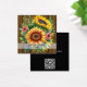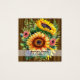 Um cartão de visita com uma frente de madeira com um arranjo floral com girassóis.