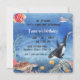 Uma cena submarina colorida com peixe, coral e um bolo de aniversário. Perfeito para um convite de aniversário de criança.