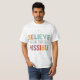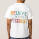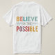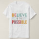 A camiseta apresenta uma mensagem ousada e estimulante: "Acredite no Possível". O texto é renderizado em um esquema multicolorido, com cada palavra uma tonalidade vibrante diferente. Isto cria um design dinâmico e inspirador que atrai a atenção.