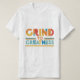 O design de camiseta ocular apresenta a mensagem motivacional "Grind to Greatness" em um estilo de grafite ousado e multicolorido. Imaginem letras vibrantes se sobrepondo e pingando com energia, perfeitas para aqueles que se movimentam com um talento artístico.