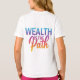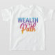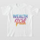 A t-shirt apresenta a frase "Riqueza é o Caminho" num gradiente multicolorido vibrante. Cada palavra transita suavemente para a próxima, criando um design dinâmico e atraente.