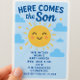 Celebre a chegada do seu pequeno sol com o nosso elegante cartão de convite vertical "Aqui vem o filho". Perfeito para chás de fraldas, batizações ou anúncios de nascimento, esta carta maravilhosamente projetada apresenta um fundo de gradiente macio com delicados motivos solares que simbolizam novos começos. O formato vertical oferece uma reviravolta moderna em convites tradicionais, permitindo uma apresentação visual impressionante que se destaca pela multidão. Cada cartão é impresso em estoque de cartão premium com uma textura sutil que adiciona um toque de sofisticação. Campos de texto personalizáveis permitem personalizar cada detalhe, mantendo a estética coesa do design, que encantará seus convidados e criará uma manutenção memorável dessa ocasião especial.