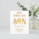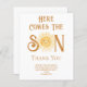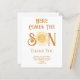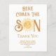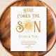 O cartões de agradecimentos de chá de fraldas deste rapaz do orçamento apresenta o texto "Aqui Vem O Filho" na tipografia marrom na moda com um sorridente sol de aquarela amarela. Facilmente personalizável. Original Watercolor © Michele Davies.