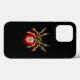 Aranha mecânica, com pá-pá de ouro, engrenagens de latão e uma lâmpada de vidro vermelha sobre fundo preto. Estilo Steampunk.