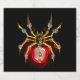 Aranha mecânica, com pá-pá de ouro, engrenagens de latão e uma lâmpada de vidro vermelha sobre fundo preto. Estilo Steampunk.