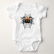 Uma aranha preta bonita vestida com um chapéu laranja de bruxa do Dia das Bruxas na aranha do Halloween, camisetas, carroças, cartões, adesivos, sacos de tote, ímãs e outros artigos de design e presentes do Halloween.