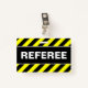 Características deste design do crachá um teste padrão listrado preto e amarelo, junto com a mensagem "ÁRBITRO" no texto corajoso. Poderia talvez ser vestido pelo árbitro de um fósforo de esportes.