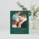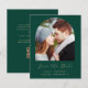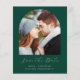 Este simples e minimalista Cartão Salvar a Data apresenta um boho de fotos acima das palavras "Salvar a Data" em um elegante guião de manuscrito dourado, seguido pelos nomes dos casais, data do casamento e cidade em sans serif em um fundo verde esmeralda. Adicione uma mensagem mais detalhada com informações adicionais no verso, juntamente com um código QR que envia convidados para o seu site de casamento.