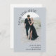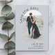 Bela simplicidade e estilo artístico fazem com que este casamento artístico moderno salve a pop com apelação o cartão de data. ele apresenta um modelo de foto em forma de arco na frente do cartão para carregar sua foto desejada. Há uma modelo de texto na frente da carta para personalizar com os nomes da noiva e do noivo e a data de casamento planejada. A parte traseira deste cartão tem um exemplo de mensagem com detalhes adicionais para personalizar. Mostrada aqui com um fundo azul claro empoeirado, este cartão está disponível em outras cores também.