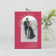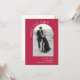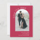 Bela simplicidade e estilo artístico fazem com que este casamento artístico moderno salve a pop com apelação o cartão de data. ele apresenta um modelo de foto em forma de arco na frente do cartão para carregar sua foto desejada. Há uma modelo de texto na frente da carta para personalizar com os nomes da noiva e do noivo e a data de casamento planejada. A parte traseira deste cartão tem um exemplo de mensagem com detalhes adicionais para personalizar. Mostrada aqui com o popular novo fundo magenta, esta placa está disponível em outras cores também.