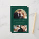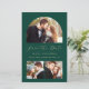 Esta simples e minimalista placa Save the Date apresenta um arco de colagem de fotos, com uma foto horizontal no topo e duas fotos quadradas abaixo. Entre as fotos de cima e de baixo, as palavras "Salvar a Data" aparecem em um elegante roteiro de manuscrito dourado, seguido dos nomes dos casais, da data do casamento e da cidade em sans serif em um fundo verde esmeralda. Adicione uma quarta foto horizontal e uma mensagem mais detalhada com informações adicionais no verso.