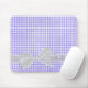Fita branca translúcida e arco com nome sobre fundo de gingham branco e roxo. O nome é editável ou pode ser excluído.