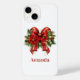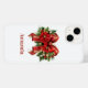 Uma capa de telefone com um arco festivo de Natal em vermelho e ouro. Cercados por flores de poinsettia, pinheiro e decorações de Natal.