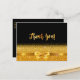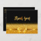 Um fundo preto elegante e um arco de ouro falso e fita com brilho e brilho de ouro. Na frente, um estilo escrito à mão e o texto: Obrigado! Voltar: Modelo para sua nota de agradecimento e nome/nomes Perfeito para uma festa de aniversário, aniversário, casamento, chá de panela ou chá de fraldas.