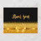 Um fundo preto elegante e um arco de ouro falso e fita com brilho e brilho de ouro. Na frente, um estilo escrito à mão e o texto: Obrigado! Voltar: Modelo para sua nota de agradecimento e nome/nomes Perfeito para uma festa de aniversário, aniversário, casamento, chá de panela ou chá de fraldas.