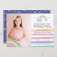 Divertido, colorido e branco aquarela arco-íris com tema de celebração de festa de aniversário convite para fotos design em paleta colorida de rosa, azul, lacre, limão, laranja e roxo. O design apresenta uma bela ilustração do arco-íris e das nuvens com uma coloração aquosa de padrão de faixa com coloração colorida, com o convite detalhado de forma clara dentro das listras coloridas, criando uma aparência moderna e limpa. Grande espaço para você colocar sua própria foto. O verso do convite fotográfico apresenta um confete colorido, um padrão de bolinhas de gotas de chuva com sotaques falsos de folha de ouro contra um fundo roxo profundo, que complementa maravilhosamente o trabalho de arte frontal. Todas as ilustrações contidas neste convite para fotos da festa de aniversário de aquarela mágica colorida do arco-íris são obras de arte originais desenhadas à mão pela Moodthology. Você pode personalizar o tamanho do texto, a cor do texto, a fonte e o layout para sua preferência de design pessoal.