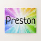 Personalize este quebra-cabeça de 30 peças com o nome da criança ou qualquer palavra! Excelente para construir habilidades de coordenação e pensamento para crianças pré-escolares ou qualquer um! Arco-íris brilhante com raios brilhantes e nome em impressão preto divertido.