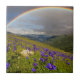 Esta foto caracteriza um arco-íris sobre um campo de wildflowers do bluebonnet à sombra de uma cordilheira.