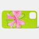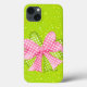 Capas de iphone maravilhosa com arcos e fitas brilhantes, cor-de-rosa e verde, com bolinhas brancas. Personalize-o com o texto e a cor de fundo.