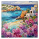 "Arcos Pelo Mar". Uma vista idílica de uma bela baía, com um barco solteiro. Uma pequena praia arenosa é enquadrada por um belo mar de azure e flores rosa e roxas.