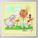 Impressão de viveiros de jardim zodíaco bonito com gato e ovelha em pé no campo de flores e grama. Sinal de Aries.