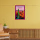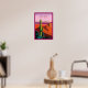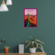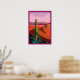 Este design é um poster contemporâneo com uma simples expressão gráfica de paisagem desértica em vermelho quente, rosa e roxo com cactus saguaro em primeiro plano. Abreviação de texto "PHX" aparece na parte superior da poster e "Arizona" em pequeno tipo branco na parte inferior.