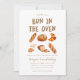 Cartão de convite para chás de fraldas bonito e moderno com ilustração aquosa de vários pães. Design neutro em termos de gênero. O texto diz "há um pão no forno."