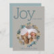 Tendências em tons de azul poeirento e folhagem de filodendro dourado cercando uma moldura de foto redonda com fundo cinza cogumelo. Alegria para o Mundo em fonte contemporânea (que você pode alterar se desejar). Fácil de personalizar - o verso é um segundo local para uma foto favorita, ideal para seus amigos e familiares enquadrarem!